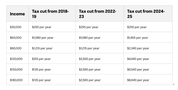 在这个减税计划中, 年收入在5-9万澳元的人来说,可减税$1080澳元, 年收入在9-10万澳元的人可减税$1215澳元, 年收入在10-12万澳元的人可减税$1665澳元, 年收入在12-20万澳元的人可减税$2565澳元。