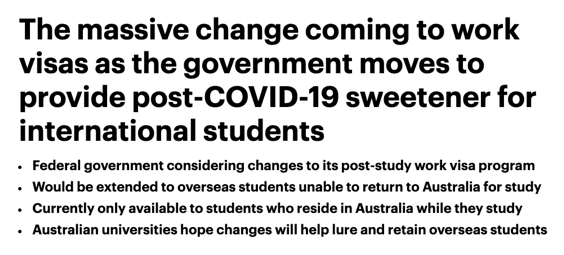 这一政策转变旨在提高澳大利亚大学在边境仍然关闭的情况下留住亚洲学生的能力,因为北美和英国的大学吸引了许多国际学生。