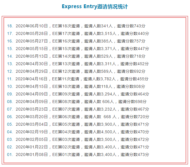 今天加拿大时间6月10日,北京时间6月11日,联邦快速通道移民Express Entry再次如期针对雇主担保省提名类别进行了ITA移民邀请:
