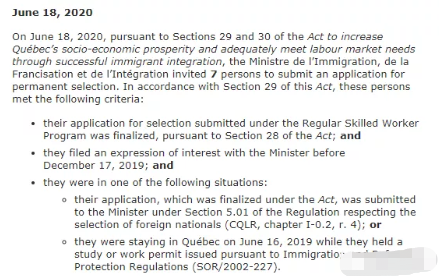 魁省本轮所公布的筛选标准也相对模糊,本轮获邀的7个人都是在2019年12月17日之前就向魁省移民局提交了申请意向书,并且在当时已经是魁北克的临时居民,持有工作或学习的许可证。