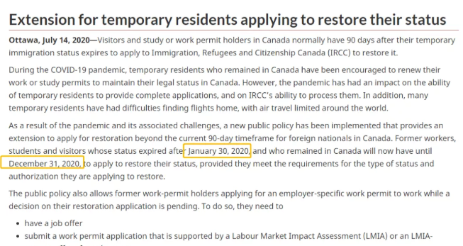 现在因为疫情,很多人在加拿大境内的身份过期,但又不能出境,移民局出台了更加人性化的临时措施,给了一整年的时间来恢复身份(Restore your status):2020年1月30日-2020年12月31日。