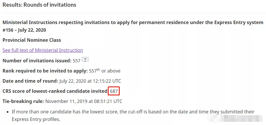 加拿大时间2020年7月22日,联邦快速通道(以下简称“EE”)进行了最新一轮的抽签,本轮邀请对象为省提名类候选人,他们均已获得600分省提名加分,最低邀请分为687分,共发出557份邀请!
