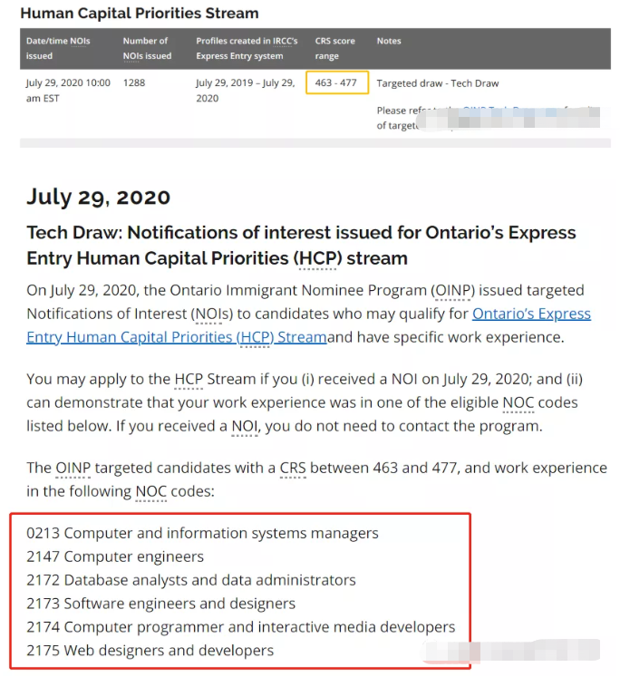 当然,邀请的最低分不低,463分,安省的邀请分数通常比联邦EE邀请分数低10来分。联邦在7月8日针对所有类别的邀请中,最低分是478分,安省的邀请虽然低了15分,但是要想获得邀请,需要在指定的6类IT职业中有1年以上的工作经验。