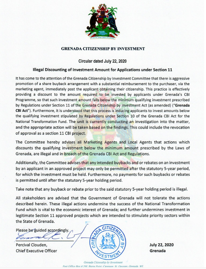 格林纳达投资入籍委员会,特此通知所有营销代理(marketing agent)和当地代理(local agent), 如果对合格投资“打折”,将不满足格林纳达法律规定的最低金额,这种行为是非法的,违反了格林纳达CBI法案和条例。