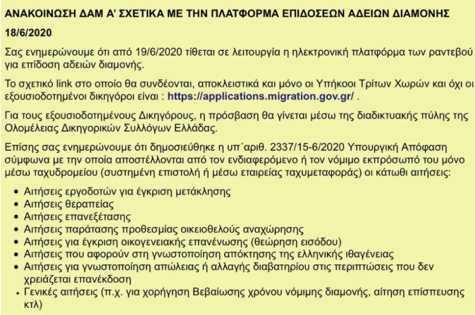根据移民与庇护部的决定,移民局将于6月19日(星期五)启动网上预约发放居留许可程序。第三国公民可以自行登入居留许可申请进度查询网站:http://pf.emigrants.ypes.gr
