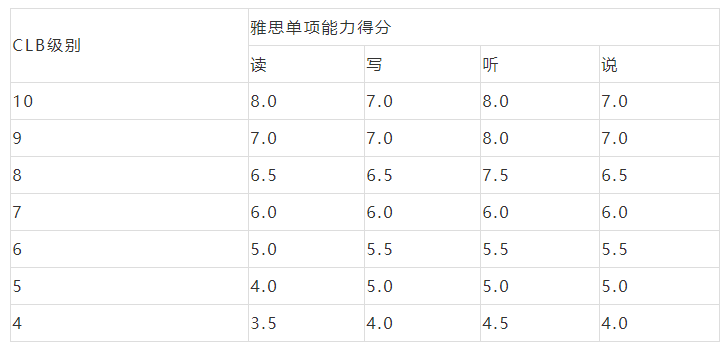 CLB是加拿大的语言标准。CLB4基本相当于雅思G类阅读3.5,写作4.0,听力4.5,口语4.0。加拿大移民对申请人的最低语言要求是CLB4。此外,加拿大移民一般都是邀请制。因此,语言成绩越高,加分越高,越容易被邀请。所以如果雅思成绩能达到4个7分左右,即CLB成绩在7分或8分左右,那就是最好的了。加拿大语言标准CLB转换雅思成绩对照表: