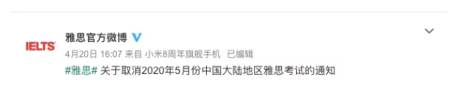 雅思官方微博4月20日消息,根据教育部对于新冠肺炎防控的安排,教育部考试中心与英国文化教育协会按要求即日起取消中国大陆地区2020年5月各类雅思考试,考试费将全额退还至考生个人报名账户。