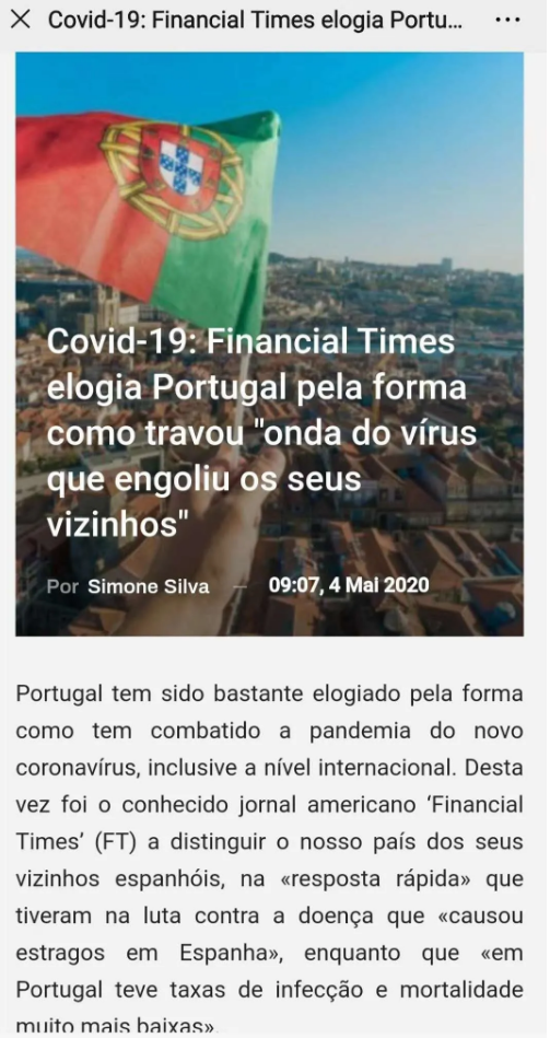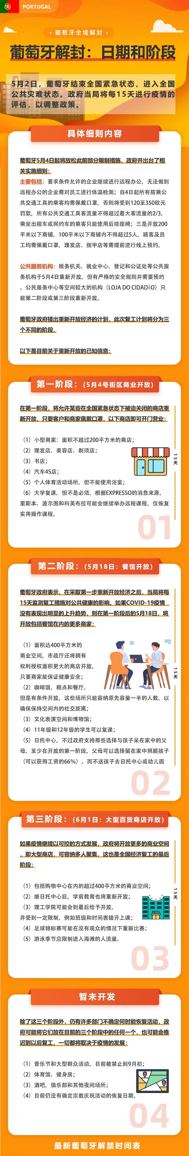 5月2日午夜,葡萄牙结束了为抗击新冠疫情而实施的持续45天的国家紧急状态,自5月3日零时起进入灾害状态。这标志着葡萄牙疫情应对举措降级,由全面防疫转向抗疫与恢复经济并举。葡萄牙总理科斯塔强调,结束国家紧急状态并不意味着疫情已经消失,相反必须保持高水准的遏制态势,继续抗击新冠疫情。葡萄牙卫生部长特米多日前表示,葡萄牙在紧急状态下采取的各项措施取得明显成效,目前高峰已经过去。欧洲已过新冠疫情高峰,多国媒体称赞葡萄牙抗疫举措:葡萄牙成“欧洲榜样”。美国媒体《金融时报》在近日发表的文章中高度赞扬了葡萄牙在新冠疫情作战中的积极举措,政府及时有力的防范措施,广泛的测试和葡萄牙人的自律是大大降低感染率和死亡率的主要原因。政府把疫情应对级别降为“灾害状态”,并分三步重启经济社会活动。根据政府公的“三步走”计划,葡萄牙将于4日开始正式步入经济社会“重启”模式:5月4日起:在保持社交距离,戴防护口罩的前提下,200平方米以下的一批小型商铺、公共场所和街边店如理发店、美容院、图书馆等开始恢复运营;