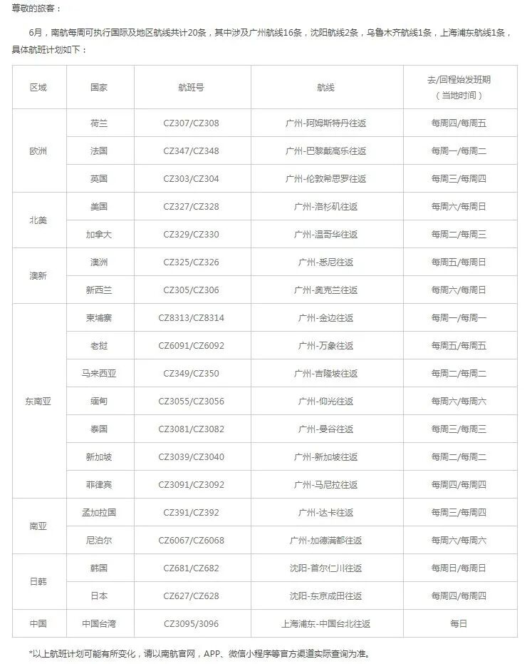 南航方面,6月份每周可执行国际航线共20条,其中涉及广州航线16条、沈阳航线2条、上海浦东航线1条、乌鲁木齐航线1条。