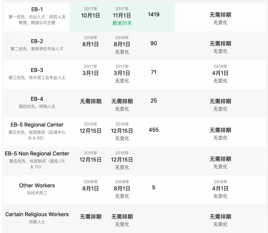 职业移民本月稳步前进,EB1、EB2、EB3和EB4均前进7天。