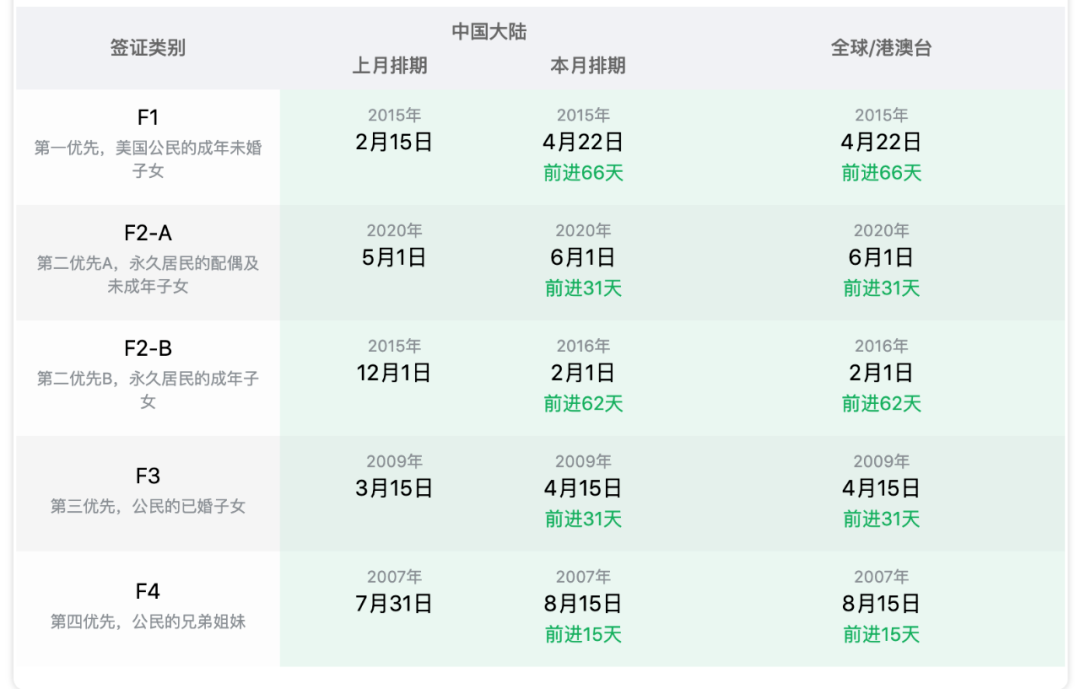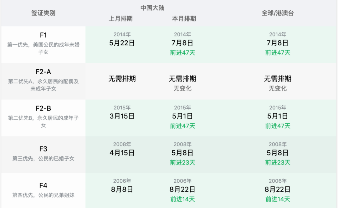 亲属移民较大幅度前进,F1和F2前进47天, F3前进23天,F4前进14天。