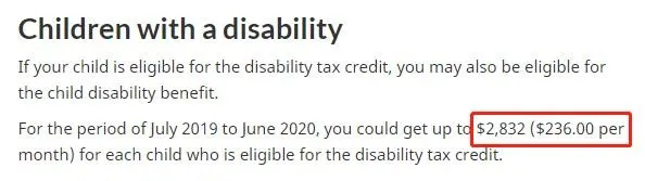 残疾儿童:可以获得儿童残疾津贴,在2019年7月至2020年6月期间,每个有资格领取残疾津贴的儿童最高可获得$2832(每月$236)。