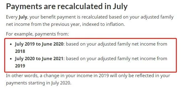 每年7月,政府将根据前一年的家庭净收入计算福利,如:2019年7月到2020年6月牛奶金:根据2018年家庭净收入计算,2020年7月到2021年6月牛奶金:根据2019年家庭净收入计算。换句话说,你2019年的收入变化将只反映在2020年7月起的牛奶发放上。
