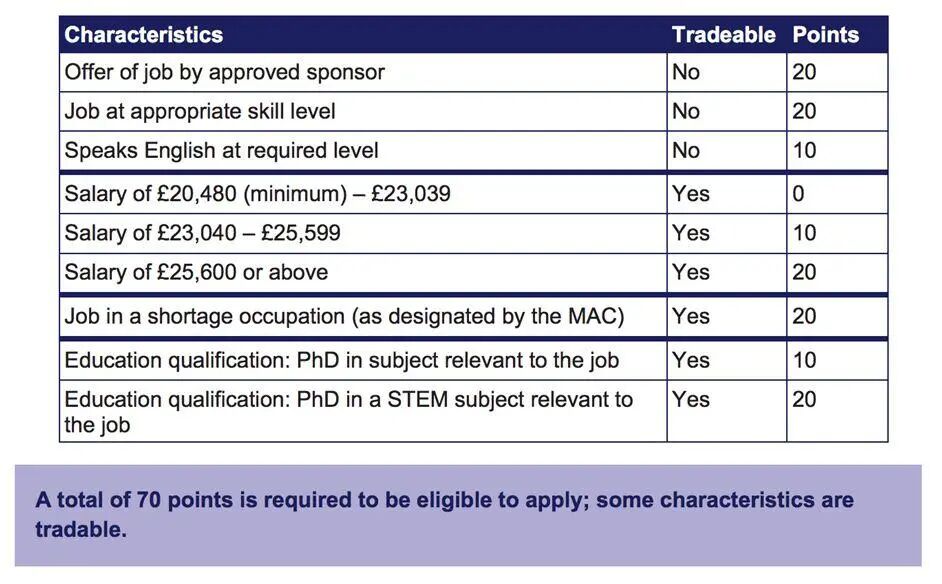 新移民体系下,变化最大的部分是在工作签证方面(Skilled Worker)。新政策实施后移民局将以积分形式审核,新的积分制将从Job offer、工作技能水平、薪酬、语言等几个方面进行打分,申请人必须达到总分最低70分,即可申请签证在英国工作。
