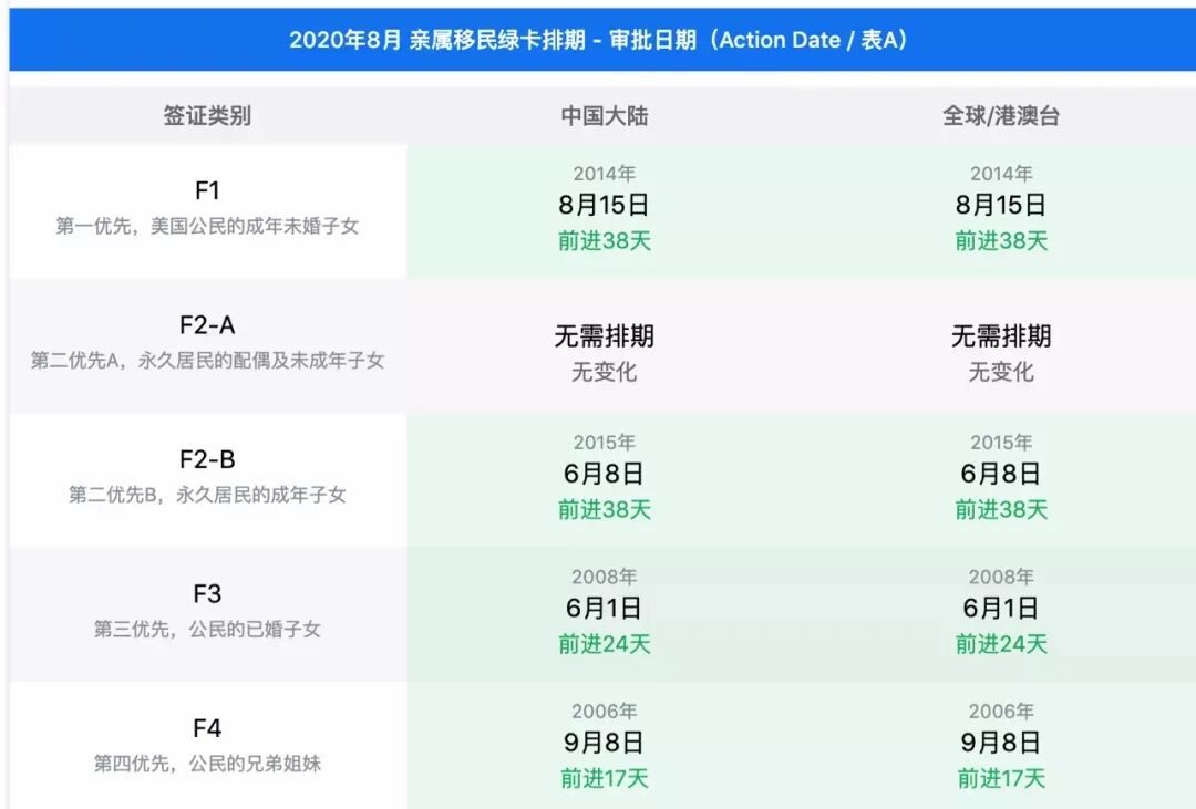 亲属类移民表A:第一优先F1类(公民的成年未婚子女)推进38天;第二优先F2A类(永久居民的配偶及未成年子女)无需排期,有名额;第二优先F2B类(永久居民的成年未婚子女(21岁及以上))推进38天;第三优先F3类(公民已婚子女)推进24天;第四优先F4类(成年公民的兄弟姐妹)推进了17天。