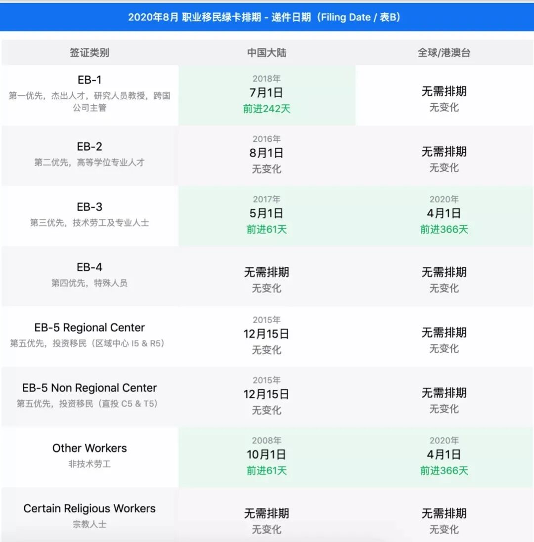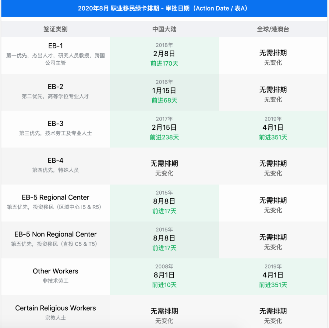 职业移民表A:EB1(杰出人才)推进170天;EB2(具高等学位或特殊能力者)推进68天;EB3(技术类专业劳工)推进238天;非技术劳工推进10天;EB4无须排期,有名额;EB5(直投与区域中心)均推进17天。