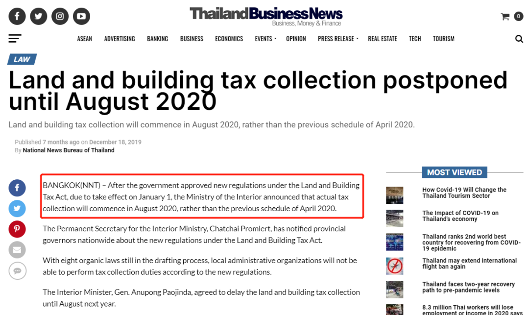 各位在泰置业的业主们注意了!几经拖延的泰国房产物业税终于将在2020年开始执行收缴了,第一次的物业税需在8月31日前向物业所在区区政府税务局缴纳,延迟交纳会有10%-40%的罚款哦。
