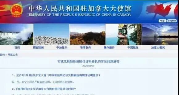 8月29日,中国驻加拿大大使馆发布了“实施凭核酸检测阴性证明登机的常见问题解答”,内容如下: