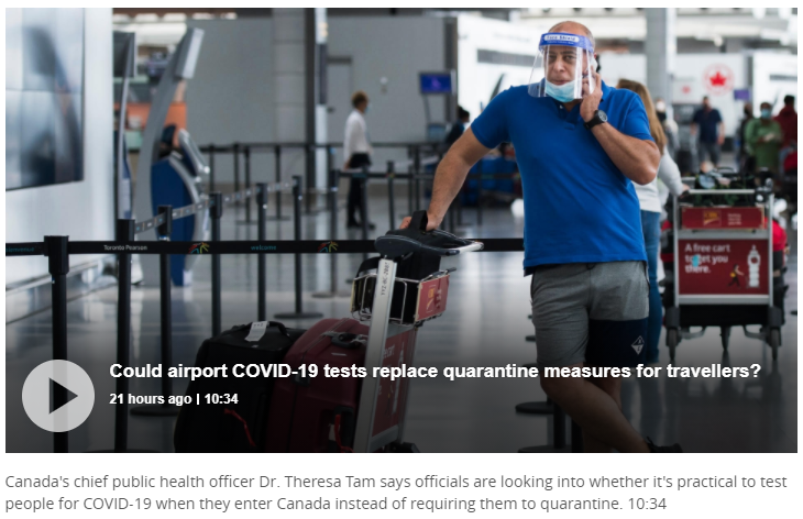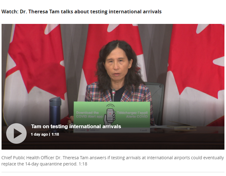 根据加拿大通讯社CBC NEWS报道,加拿大首席公共卫生官员Theresa Tam在近期健康简报会中透露,政府目前正在对人们入境加拿大后可以通过新冠病毒检测从而替代14天自我隔离这一方案进行评估。