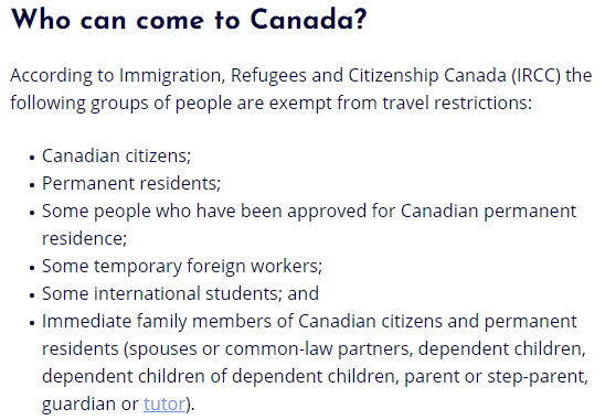 目前具备豁免禁令条件的人员包括加拿大公民、加拿大永久居民、已经获得登陆纸的准加拿大永久居民、部分签持有人、部分留学生以及加拿大公民/永久居民的直系亲属们。