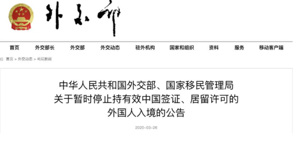 自3月26日0时起,暂时停止外国人持目前有效来华签证和居留许可入境。
