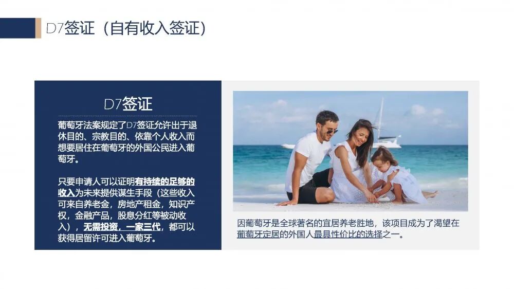 葡萄牙推出了35万欧元买房、35万欧元基金等多种投资选项,覆盖更多的潜在客户人群。在2020年还有一个备受关注的项目,就是葡萄牙自有收入签证(Own Income Visa),也叫D7签证,或者葡萄牙非盈利。