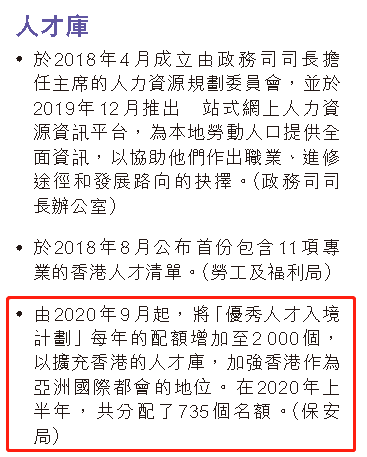 当中最最最值得注意的就是,林郑提到从2020年9月起,已将「优秀人才入境计划」每年的配额增加至2000 个,以扩充香港的人才库,加强香港作为亚洲国际都会的地位。