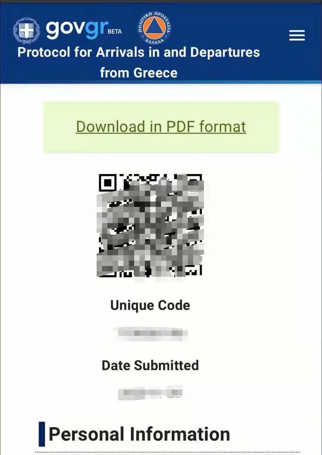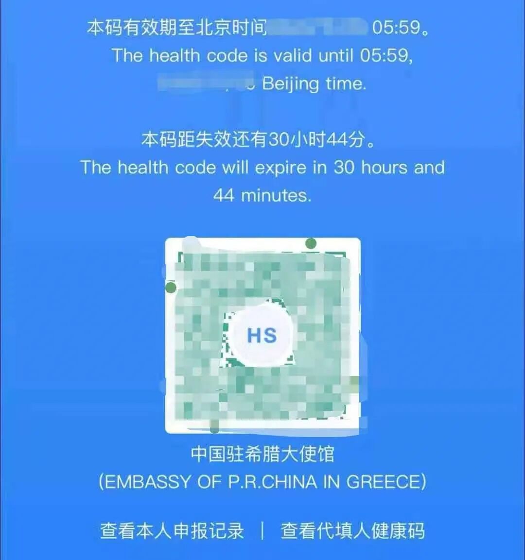 获得核酸检测、血清IgM抗体检测阴性证明后24小时内,通过防疫健康码国际版小程序,申报个人情况并拍照上传核酸检测、血清IgM抗体检测阴性证明。经中国驻希腊使馆复核通过后,可获得带“HS”标识的绿色健康码。国航将凭中国驻希腊使馆核发的带“HS”标识的绿色健康码验放乘客。