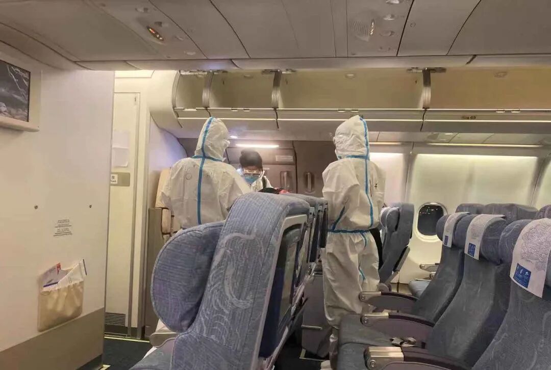 在飞机上,乘务员全副武装,穿着防护服,戴着护目镜和口罩,全程热情、耐心、周到的为乘客服务,有求必应。