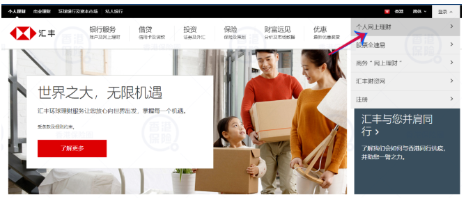 1、登录汇丰银行网银,打开电脑输入https://www.hsbc.com.hk,可以看到这样的界面。点击右上角的“登入”,选择“个人网上理财”。