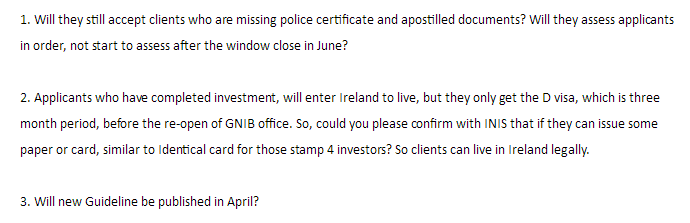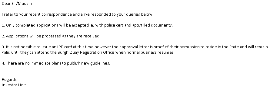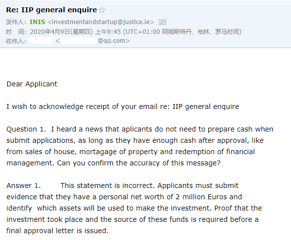 由于日前有相关投资人针对“爱尔兰投资居留计划前期准备文件时是否需要准备相应投资金额的流动资金”产生疑问,对此我们特意写邮件询问移民归化局,移民归化局肯定地回复是需要准备相应的流动资金。