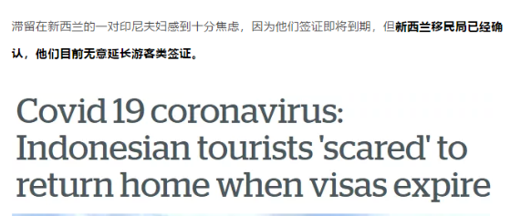 要想知道真相,我们先看这篇中文消息引用的英文原文出处。这篇公众号文章的内容来自新西兰先驱报英文版的一篇新闻,标题是:新冠肺炎:印尼游客害怕签证到期后回国。关于移民局不给延期的说法来自于下面这句话: