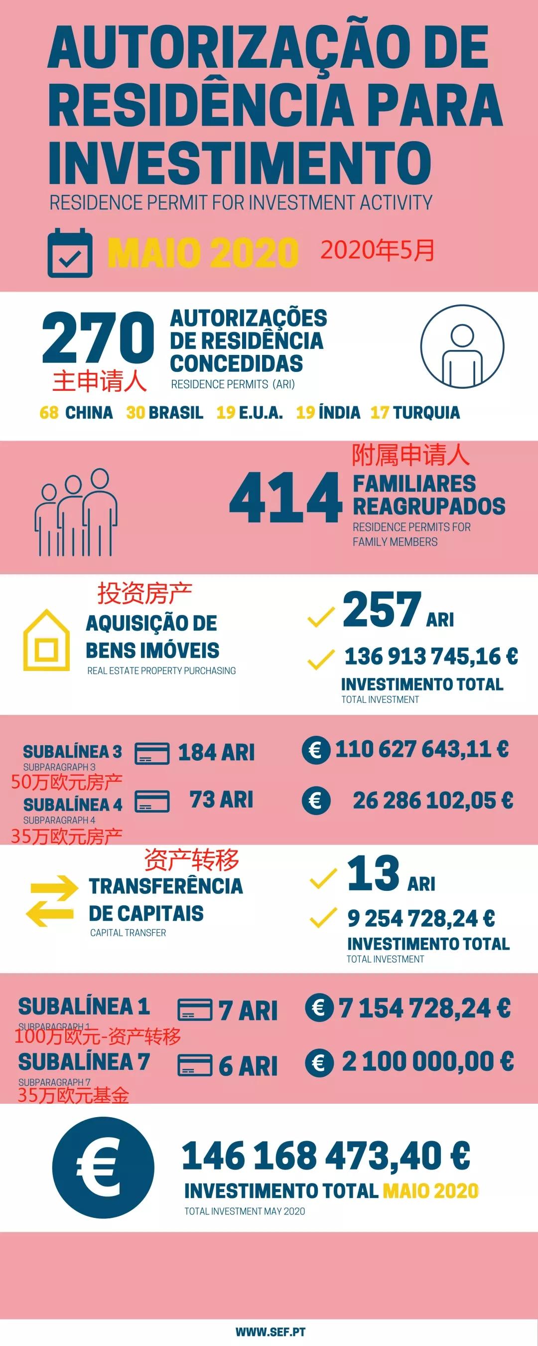 葡萄牙5月份黄金签证数据受疫情影响,葡萄牙黄金签证数量在2020年前四个月大幅下降,并最终在5月份迎来了强势回归,报复声浪大增。仅在5月份,单月批准的批数就超过了2020年前四个月批准的批数,单月吸收投资额高达1.46亿欧元(约合11.7亿元人民币)。