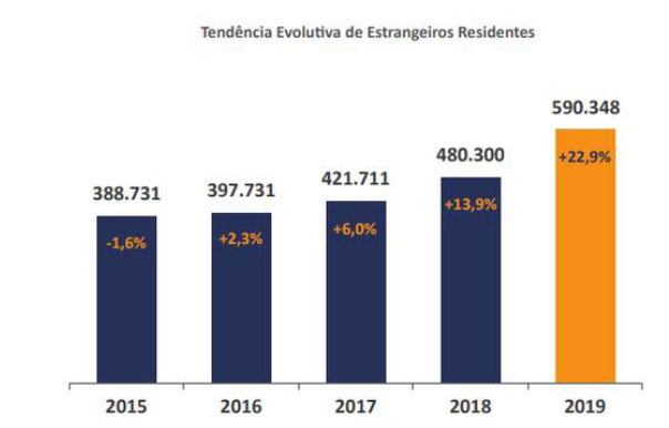 报告显示,2019年居住在葡萄牙的移民数量比2018年增加了近23%。目前有590,348名外国公民持有葡萄牙颁发的有效居留许可,为1976年以来的最高数字。