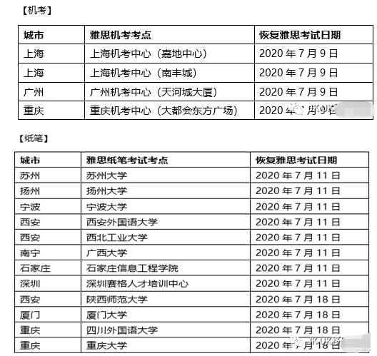7月9日,上海、广州、重庆三个机考中心的4门雅思考试已经恢复,英国国际大学(UKVI)的雅思和用于英国签证及移民的雅思(IELTS for UKVI)机考。