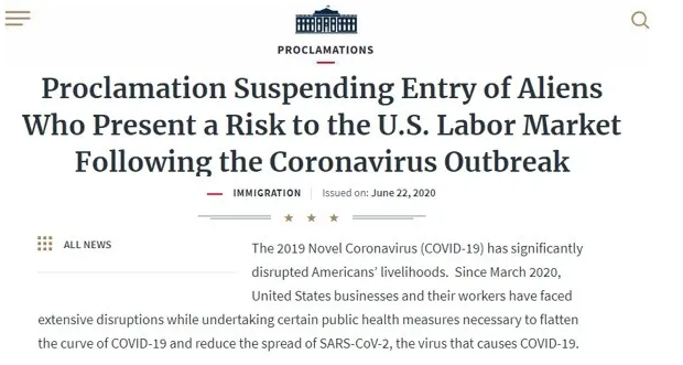 盛传了多时的关于特朗普将扩大移民/非移民限制令的消息,今天终于落实了。6月22日下午,特朗普政府发布了“关于限制疫情期间可能对美国劳动力市场带来威胁的外国人入境”(“Proclamation Suspending Entry of Aliens Who Present a Risk to the U.S. Labor Market Following the Coronavirus Outbreak”)的总统行政令。