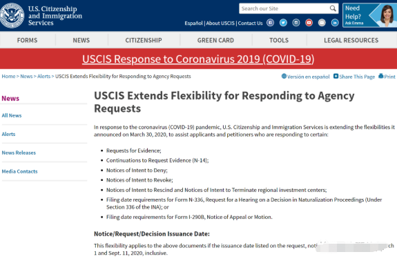 对于在2020年3月1日至9月11日期间,移民局签发的要求(request)、通知(notice)或决定(decision),申请人若在其中规定的答复截止日期后60个日历天内完成提交,USCIS将接受并进行审理。同时,移民局在正式执行决定前,申请人若在决定签发后60个日历天内提交N-336或I-290B表格,移民局也将接受并进行审理。
