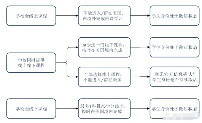 1.秋季学期仅开设线上课程的院校:目前在美国境内的国际学生将不被允许停留在美国,进行全部线上学习;目前在境外的国际学生将不被允许进入美国境内。计划在秋季学期执行全部线上授课的院校需在本月15号之前与政府相关部门进行授课方式更改的报备。