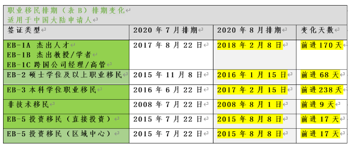 好消息!!!美国国务院签证办公室最新8月排期表出炉:EB1、EB3的排期分别大幅前进170天、238天;EB-5投资移民表A前进17天至2015年8月8日,表B没有变化(是否开启看移民局接下来的公告)。