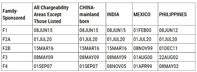 2. 截止日期(Cut-off Date):由于受到签证名额和某些类别名额已满的限制,美国国务院签证办公室(DOS)每个月会发布一个基于优先日期(Priority Date)的签证排期表(Visa Bulletin),以决定申请人何时可以提交“身份调整申请”(I-485表格),和何时可以进行领事馆程序(Consular Processing)。