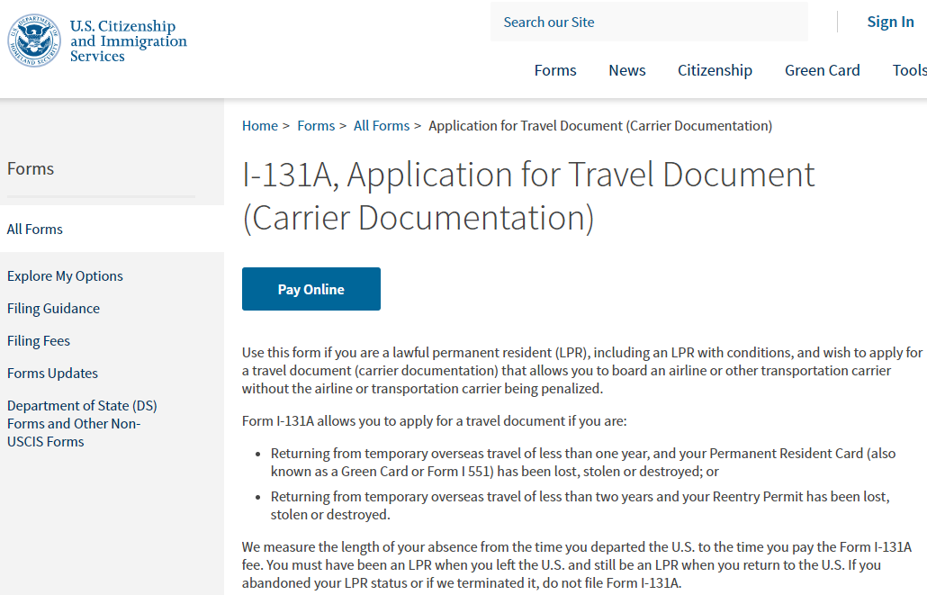 申请人必须先在移民局网站https://www.uscis.gov/i-131a上缴纳I-131A 表格申请费575美元,通过美国移民局在线支付系统,使用信用卡或借记卡或美国银行账户支付申请费。付款成功后,申请人需要保存好付款证明。