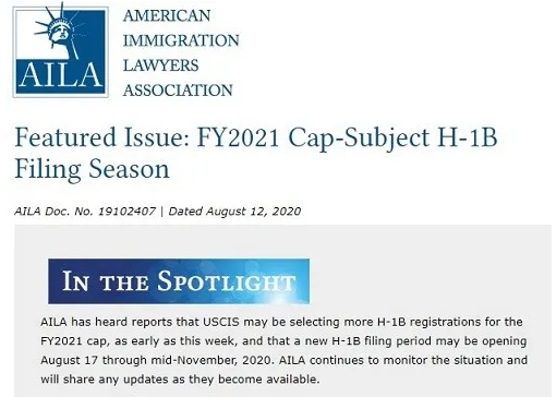 8月12日,美国移民律师协会(AILA)内部发布了最新消息:移民局将最早于本周对2021财年受抽签名额限制的H-1B进行第二轮抽签;并且,第二轮中签的H-1B递交申请的期间为:2020年8月17日到11月中旬。