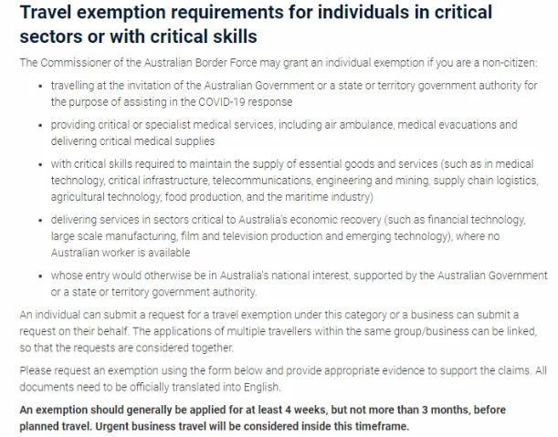 按照新增的澳洲政府认可的关键技能或在关键部门工作的外国公民可以获得豁免。