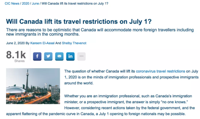 日前,加拿大移民局(CIC)在其官网撰文指出:考虑到加拿大联邦政府最近采取的行动以及加拿大新冠病毒大流行曲线明显趋于平缓,有可能在7月1日对外国人开放。