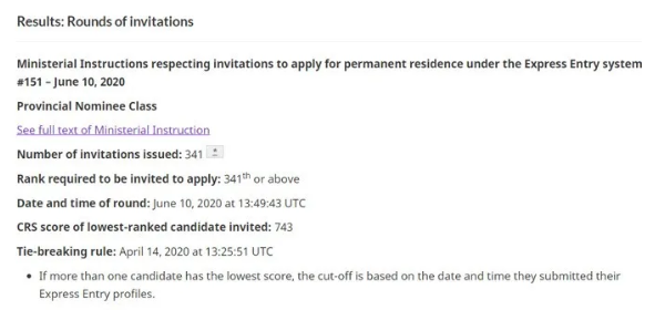 加拿大当地时间2020年6月10日,EE联邦技术移民发布最新一轮获邀数据,本次只对有省提名的申请者发放邀请,该轮获邀分数为743分,341人获邀。