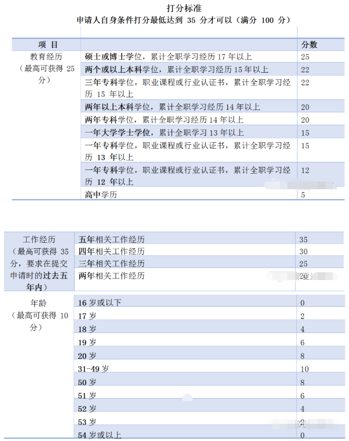 这应该是加拿大移民打分中最满足要求、最简单的打分系统了,在100分的打分标准中,只要满足35分就达到要求。举个例子,申请人只要满足规定的2年的工作经验并且有大专以上的文凭,就已经有了35分。
