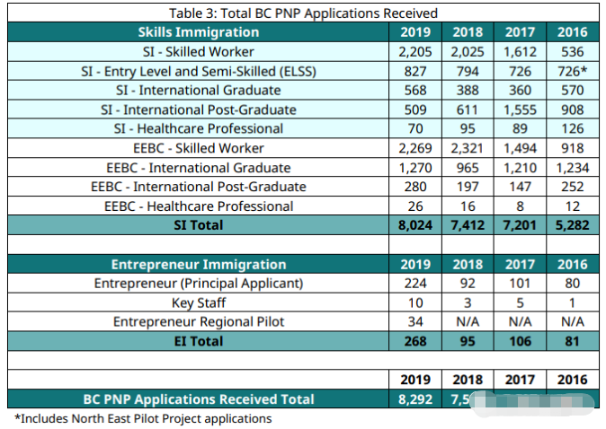 2019年BCPNP的原定配额是6500个,后增加51个,全年共有6551人获得了BC省的提名信,其中除了48位提名人是通过企业家项目获得提名外,其余全部是通过技术类别(包括海外雇主担保,低端劳工,留学生雇主担保,硕博士等)获得提名的。
