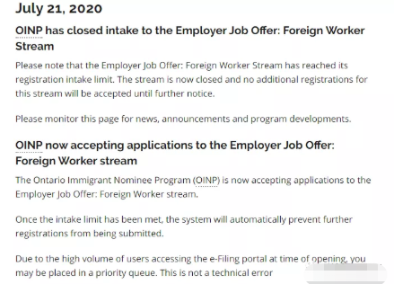 那在今天安省雇主担保正式开放申请时的情形就如同大家所预测那样,又是一次仅维持了几个小时的重开,根据安省移民局官网所述,雇主担保海外工人类别在开放数小时后便达到了名额上限,故而关闭通道直至另行通知。