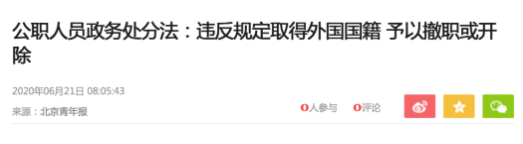 但按照《中华人民共和国公职人员政务处分法》的规定,如果到2020年7月1日时,任何还保有公职且未到正式退休年龄的公职人员,理论上只要有境外永久居留权或者有其他国家国籍就将被撤职开除。