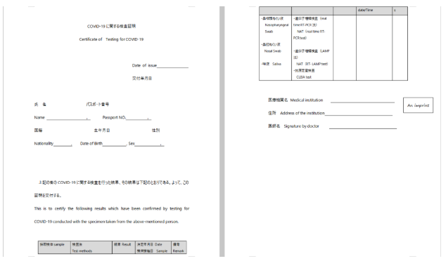 01 在回到日本之前,需要在当地的医疗机构进行PCR检测,并拿到COVID-19(新冠肺炎)相关检查合格的证明书(如下图)。必须是登机前72小时之内取得的结果才有效,附有医生签名或盖章。